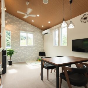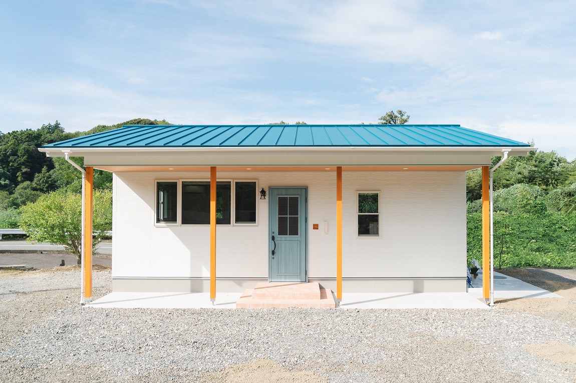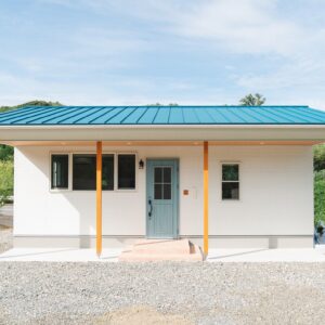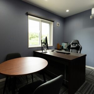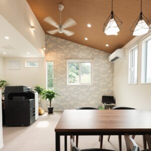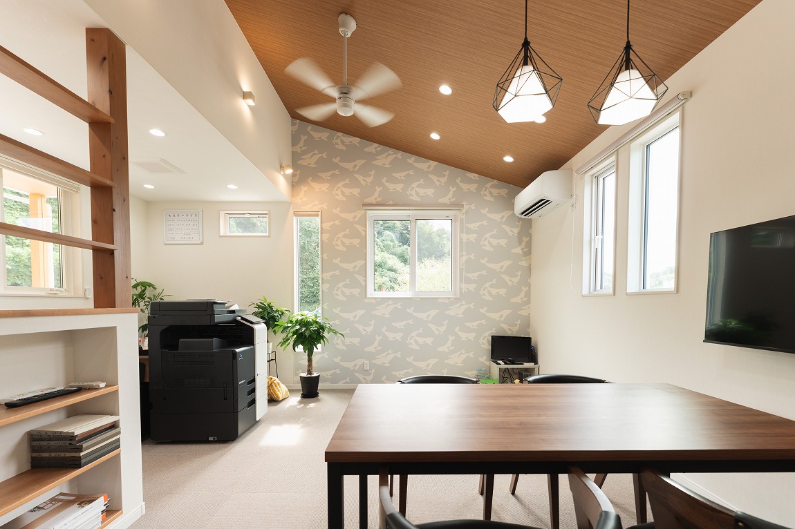 すみか住宅の新事務所は、柔らかなペールブルーの玄関扉が印象的。明るく爽やかな雰囲気で、訪れる方をやさしく迎えます。 室内は勾配天井と白を基調とした内装で、限られたスペースでも開放的に。木目のアクセントが心地よさを添え、落ち着いた打ち合わせ空間をつくりました。
