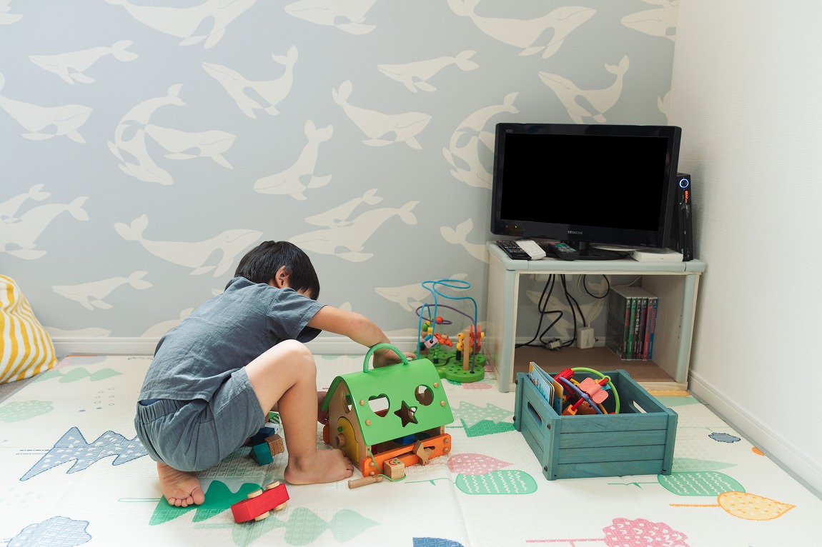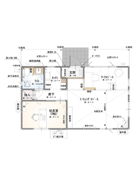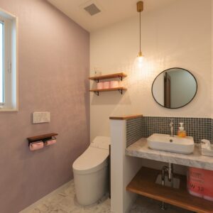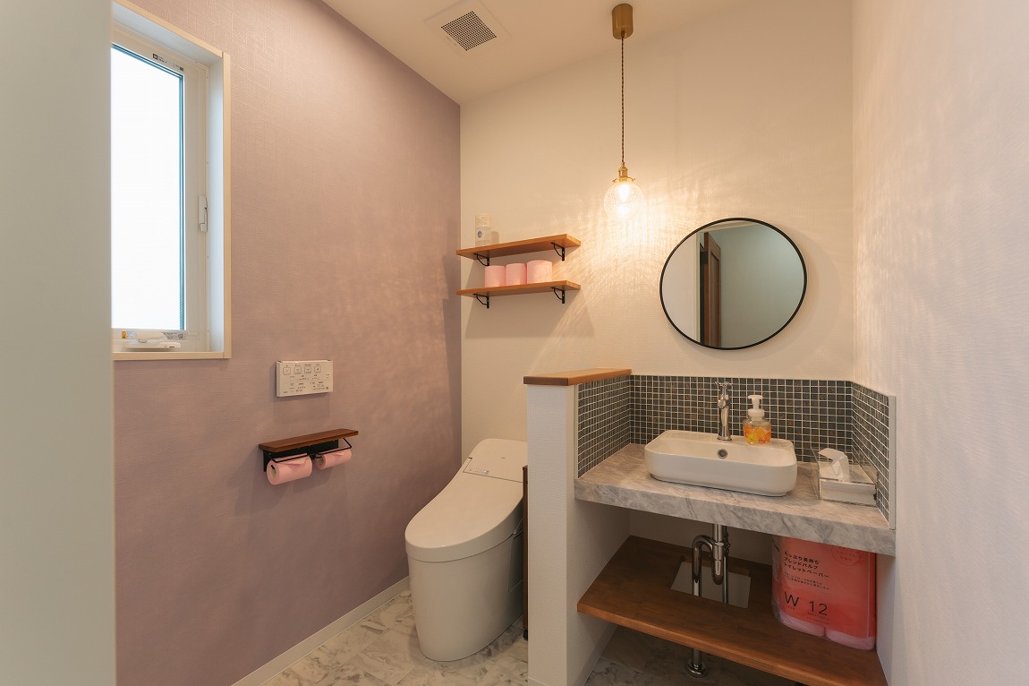 キッズスペースは色を変えた壁紙で楽しく過ごせるデザインに。角の保護で安全にも配慮しています。 社長室は一転、シックで上品な雰囲気にまとめ、空間ごとの個性を演出。 トイレは造作収納を取り入れ、清潔感と使いやすさを両立しました。